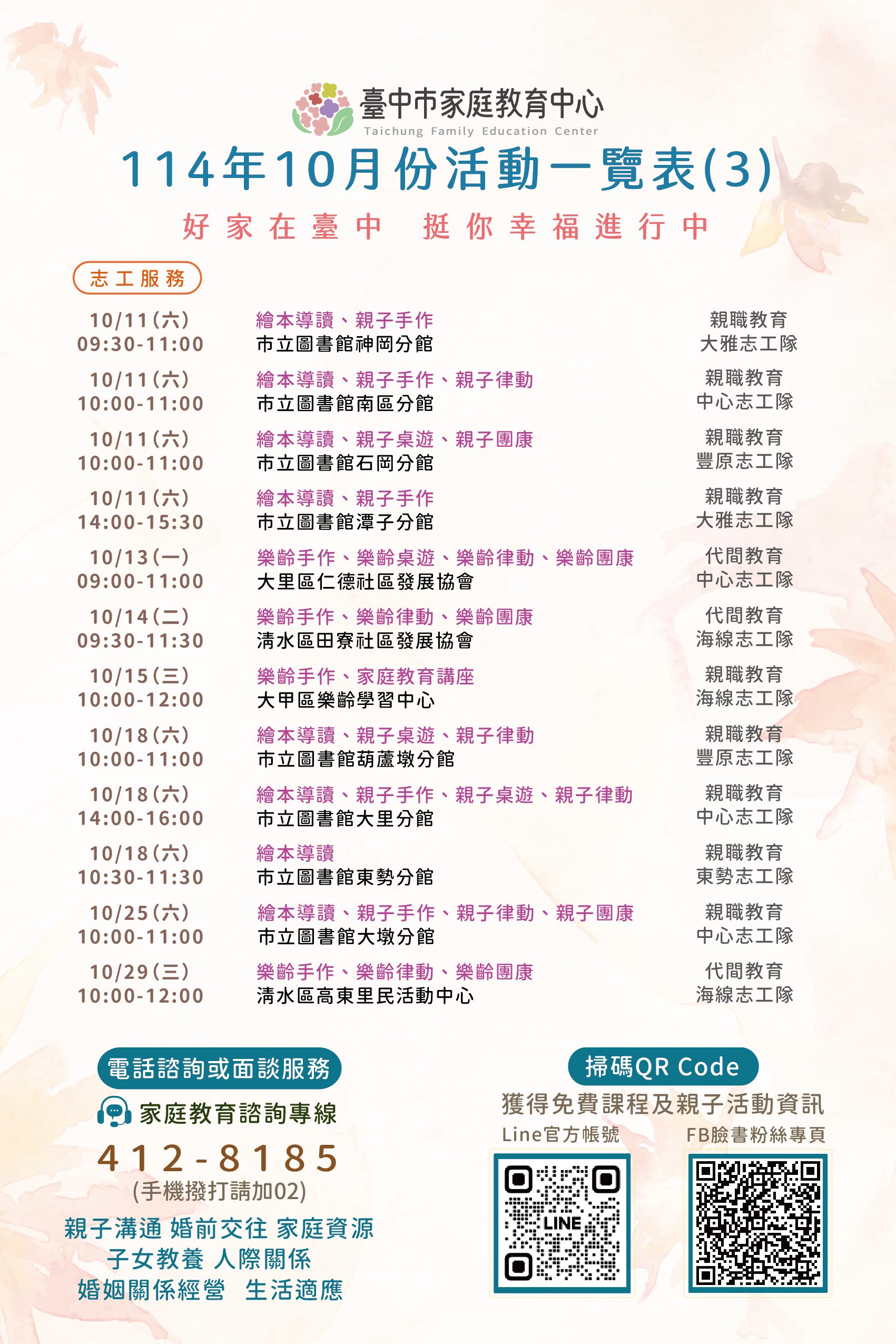 更多詳細內容洽臺中市家庭教育中心活動海報、FB及LINE公告資訊