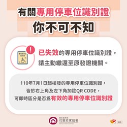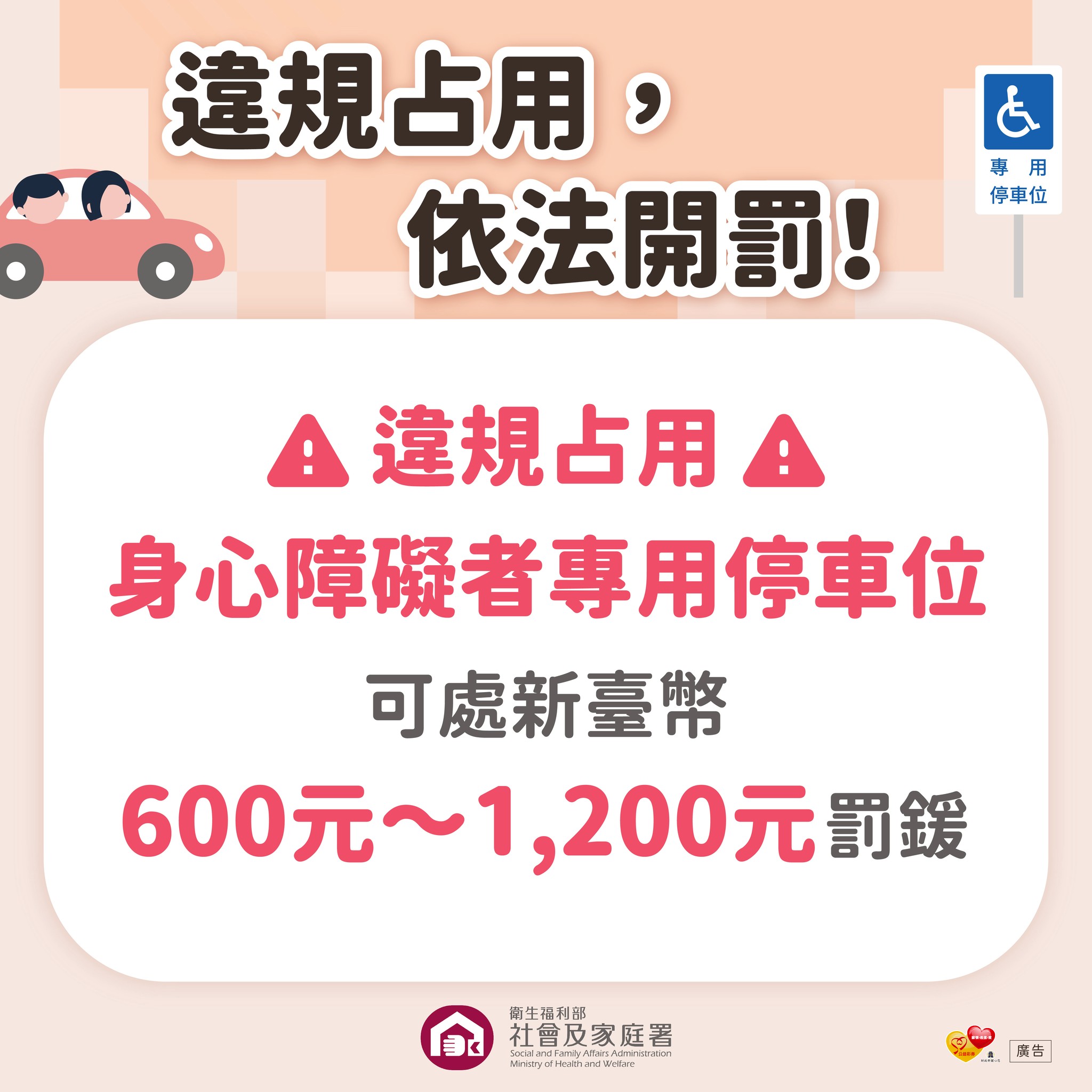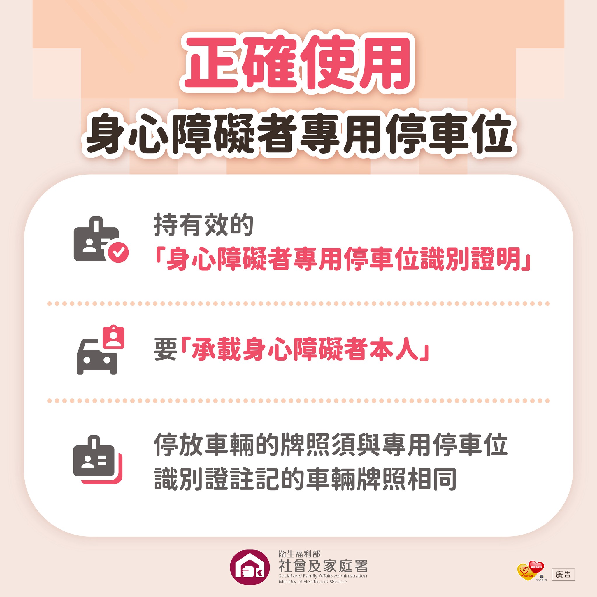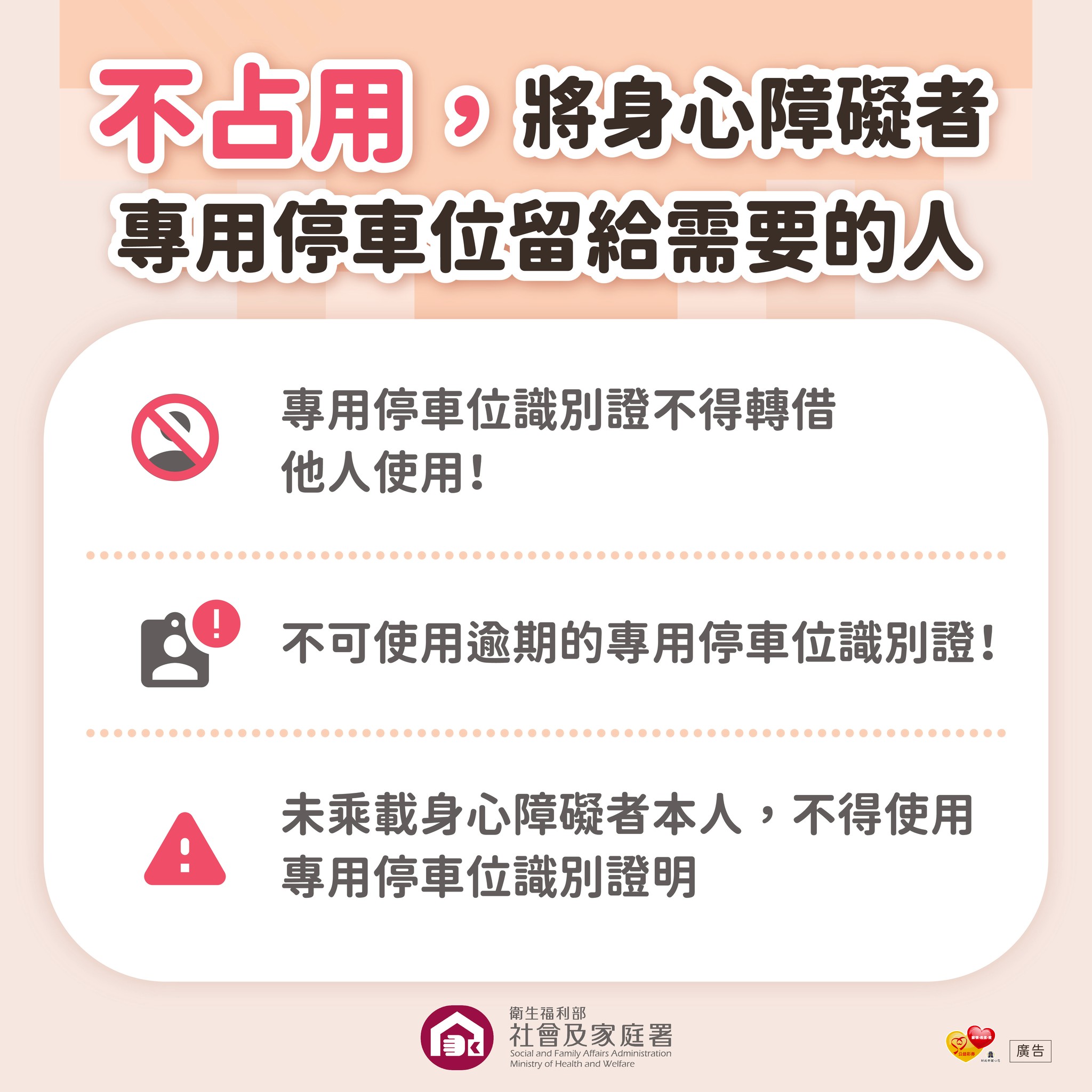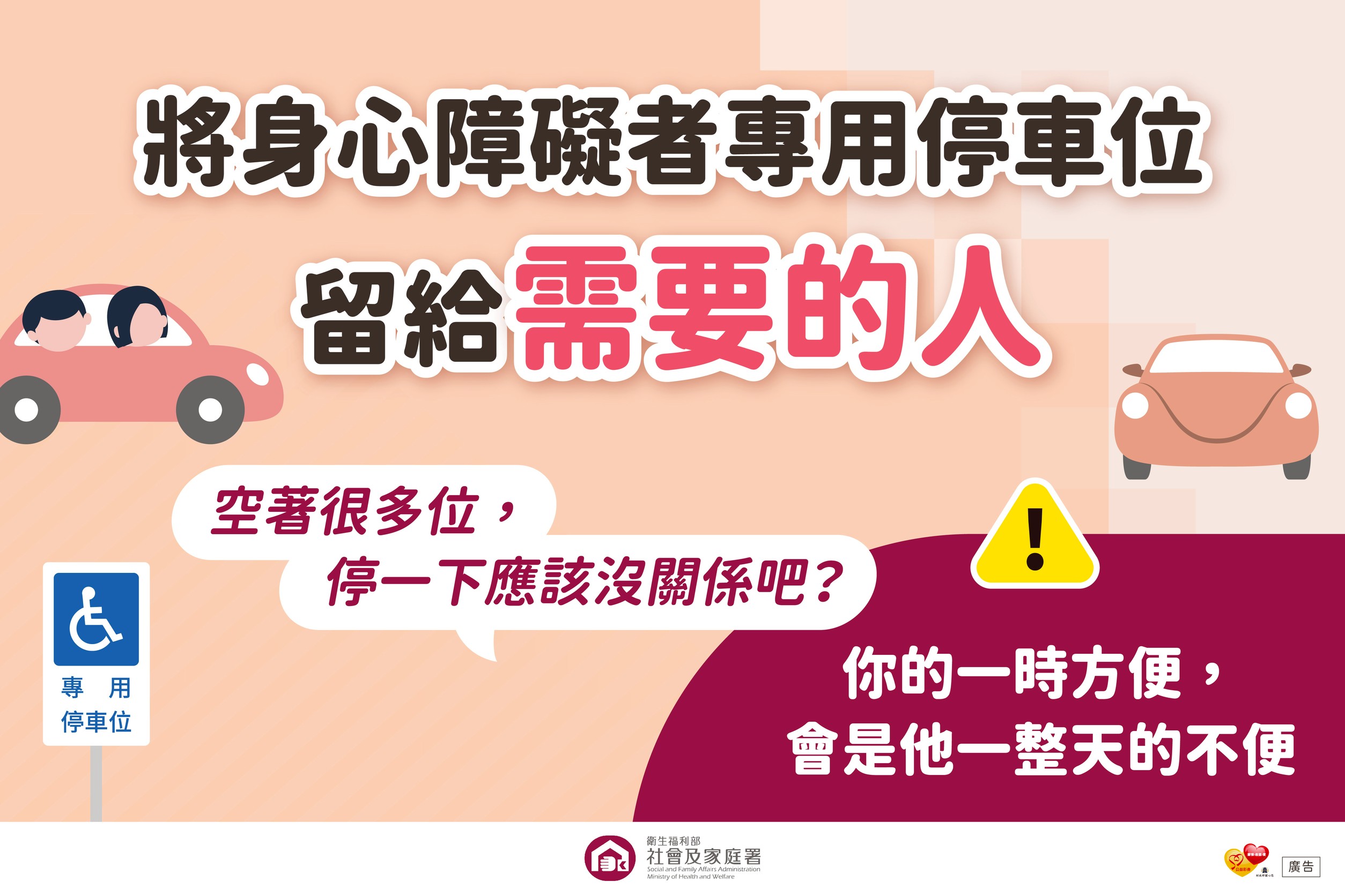 有鑑於屢次接獲民眾陳情專用停車位遭占用情事,為使民眾瞭解使用專用停車位時機以及違規占用罰鍰,爰衛生福利部社會及家庭署製作宣導圖卡,以建立國人正確使用專用停車位之觀念。
