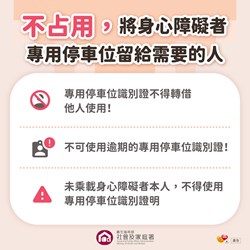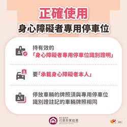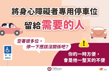 轉知衛生福利部社會及家庭署為加強宣導民眾正確使用身心障礙者專用停車位,避免占用情事發生