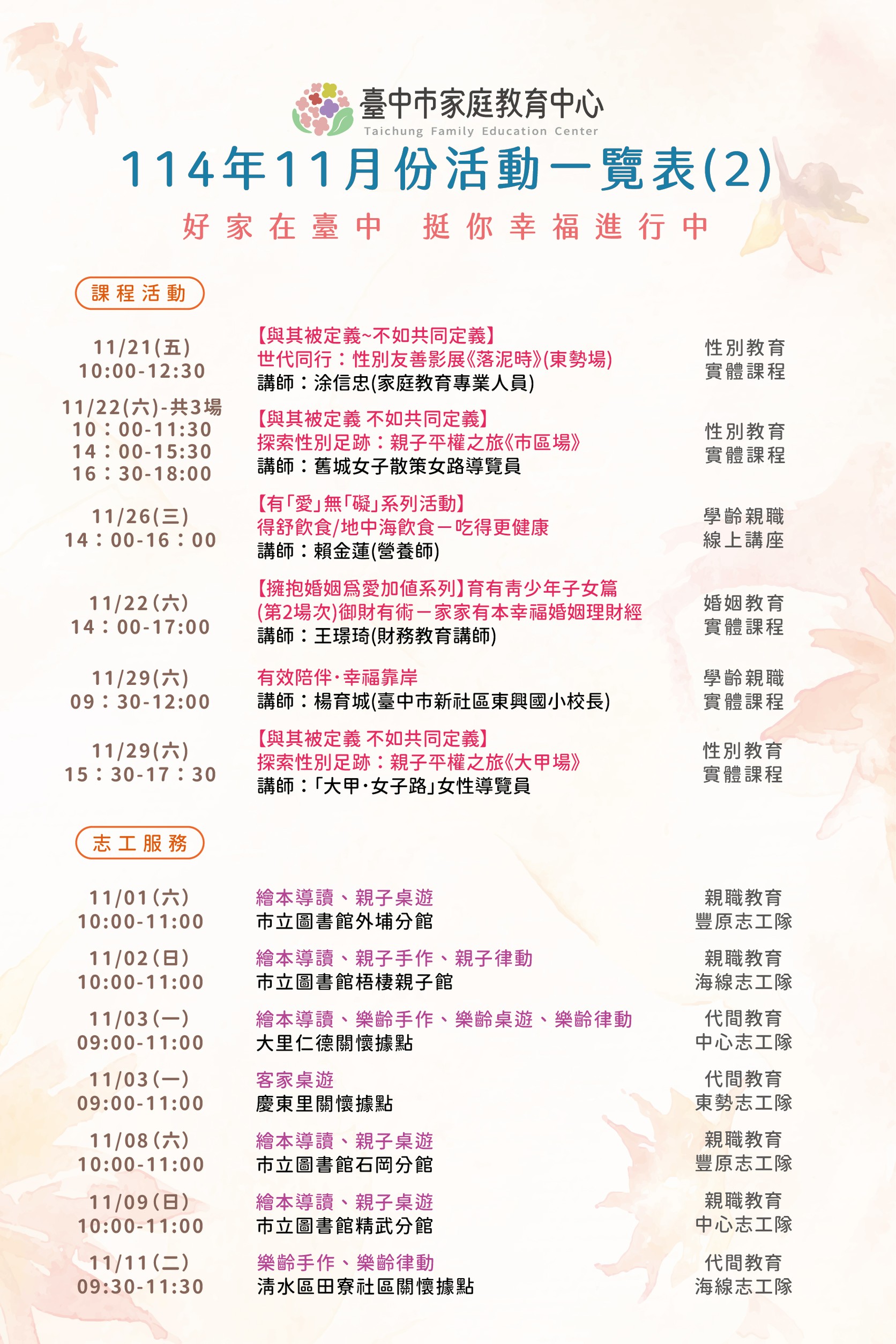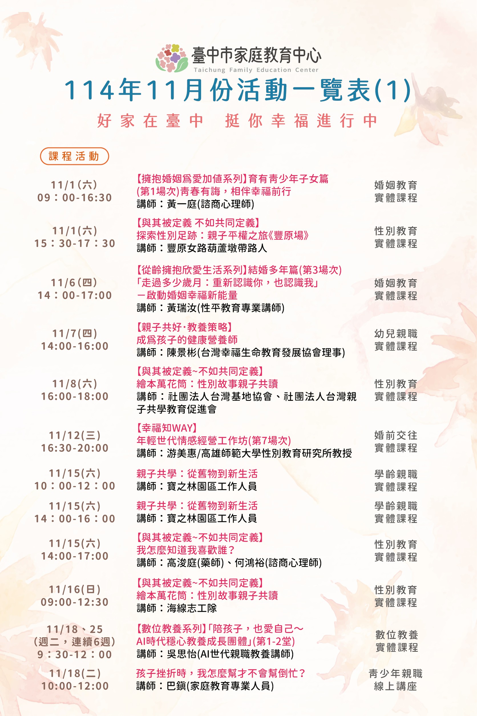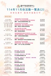 本月精彩多元的課程活動~從親職教育、數位教養、婚姻經營、青少年溝通、情緒管理、幼兒教養到到多元型態家庭學習、婚前交往準備等主題應有盡有,邀請您在溫馨互動的氛圍中學習,累積創造幸福、和諧家庭的力量!