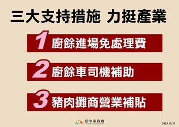 非洲豬瘟中央前進應變所及台中市政府今(31)日上午召開記者會,台中市長盧秀燕率領市府團隊一同出席。盧市長表示,跨局處防疫工作持續進行,與中央攜手防疫合作順暢,今日宣布三大支持措施,包括「免收廚餘處理費」、「發放清運津貼」、「加碼補助豬肉攤商」力挺產業,並回溯至10月23日起適用,相關補助將加快行政作業,務求資源即時送達第一線,共同防堵疫情。