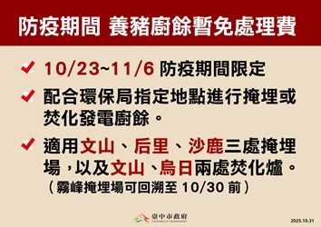 環保局指出,市府依中央指引去化廚餘,以焚化發電與沼氣發電為主、衛生掩埋為輔,臨時開設的垃圾衛生掩埋場已從9處縮減至3處,僅保留文山、沙鹿、后里三處並依規加嚴執行,每50公分廚餘即覆土30公分,每日作業結束後再加厚覆土至少50公分,全面消毒降低野生動物覓食風險,所有車輛也須完成清洗與消毒程序才可離場;同時,10月28日起已開放文山及烏日焚化廠收受養豬廚餘,昨日廚餘進廠焚化量約188公噸,累計已達540公噸,將持續彈性調度各處理設施,穩定去化廚餘。