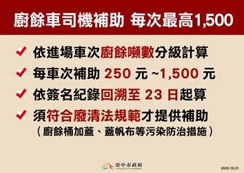 第二、針對廚餘車以每車次計算發放清運津貼:因應廚餘養豬禁令,清運駕駛須將廚餘額外運送至掩埋場或焚化爐,工作極為辛苦。他們是重要的防疫夥伴,因其配合調度,廚餘才能有序收集處理。為感謝其付出,將依據過磅紀錄的噸數,以及駕駛簽名紀錄,每車次補助250元至1,500元津貼;
