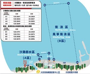 陳局長表示,大安濱海樂園是中部地區重要的觀光景點,為完善水域遊憩活動管理,並響應行政院「向海致敬」政策,市府委託國立成功大學進行專業安全評估與管理規劃,今年10月20日公告開放大安濱海樂園全區從事水域遊憩活動及實施分區管理,劃設「沙灘戲水區」及「衝浪及風箏衝浪區」兩大水域遊憩活動專區,提供民眾親水、玩沙,以及滿足衝浪與風箏衝浪愛好者的專屬動態水域。