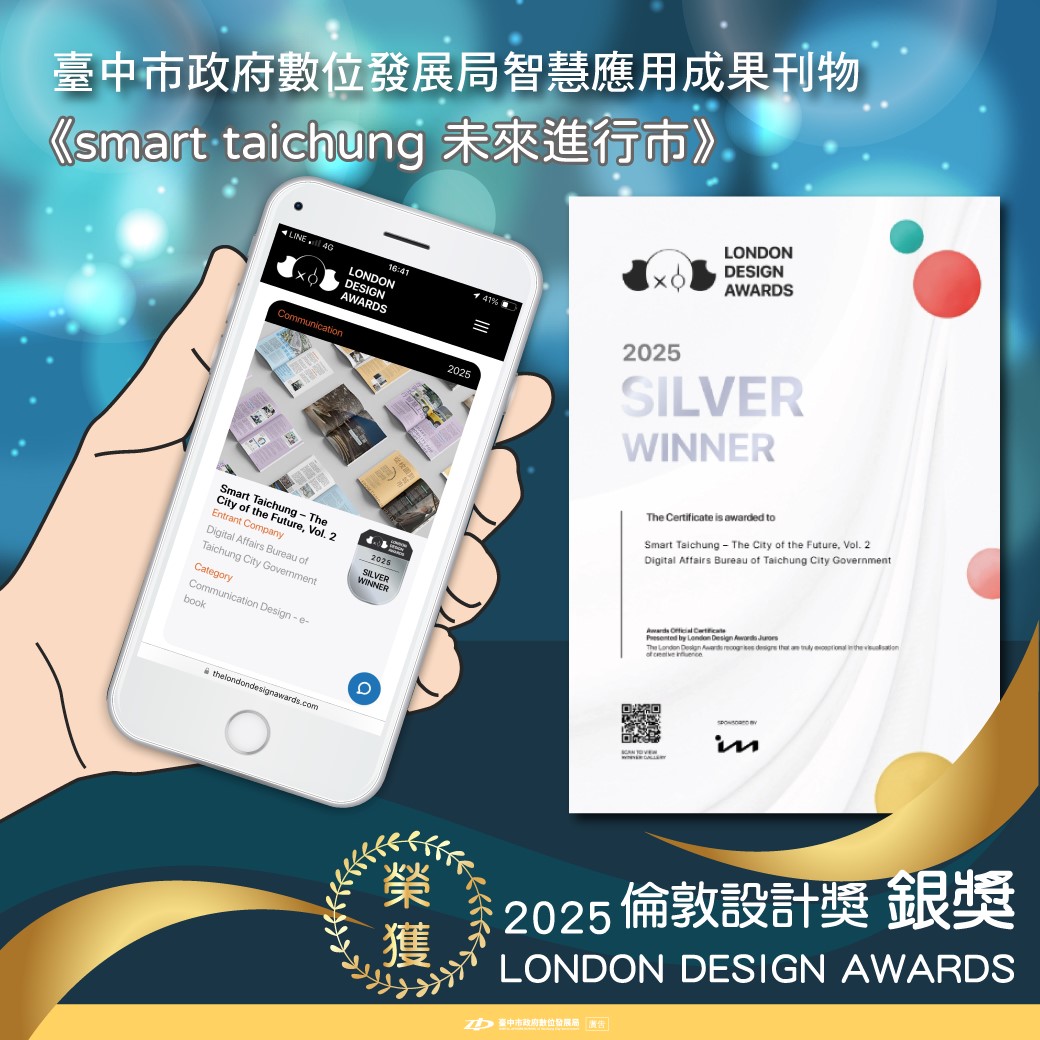 台中市政府數位發展局再傳捷報!以市民生活為出發點策劃的數位刊物《smart taichung 未來進行市》,榮獲國際獎項協會(IAA)主辦「2025倫敦設計獎(London Design Awards)」傳達設計(Communication Design)類別銀獎,成功將台中智慧治理的數位力、創意力與城市溫度推向國際舞台,提升了台中作為國際宜居城市的品牌形象。