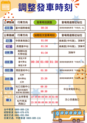 此外,交通局協調公車業者配合加開班次及延後收班,市區公車有2382延、108300303333305525及綠19條公車路線延後收班,詳細班次及站點異動資訊,可至台中公車即時動態資訊( https://citybus.taichung.gov.tw/ )或台中GO APP查詢。會場周邊也設有計程車乘車區,有需求的民眾可至經貿路及敦化路口搭乘,歡迎多加使用大眾運輸工具前往活動會場。