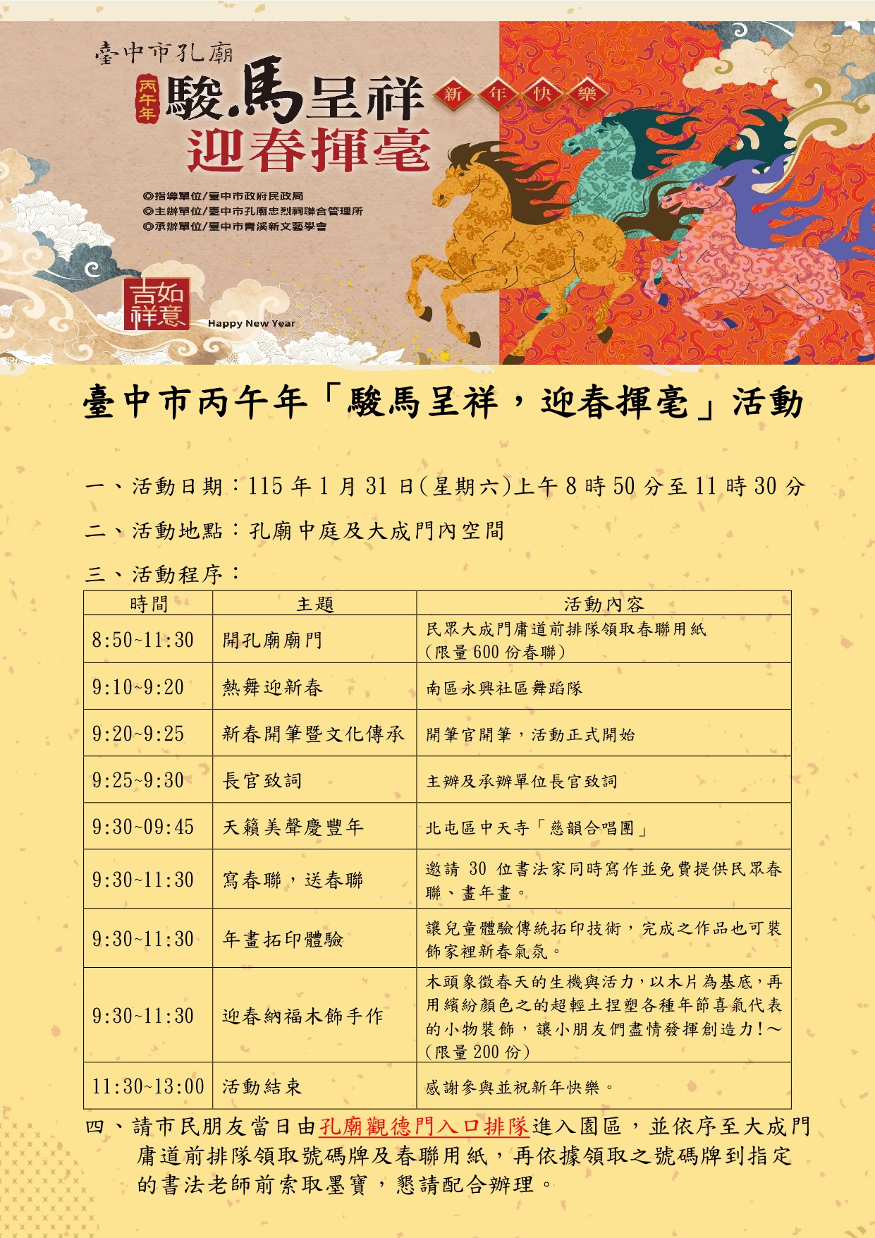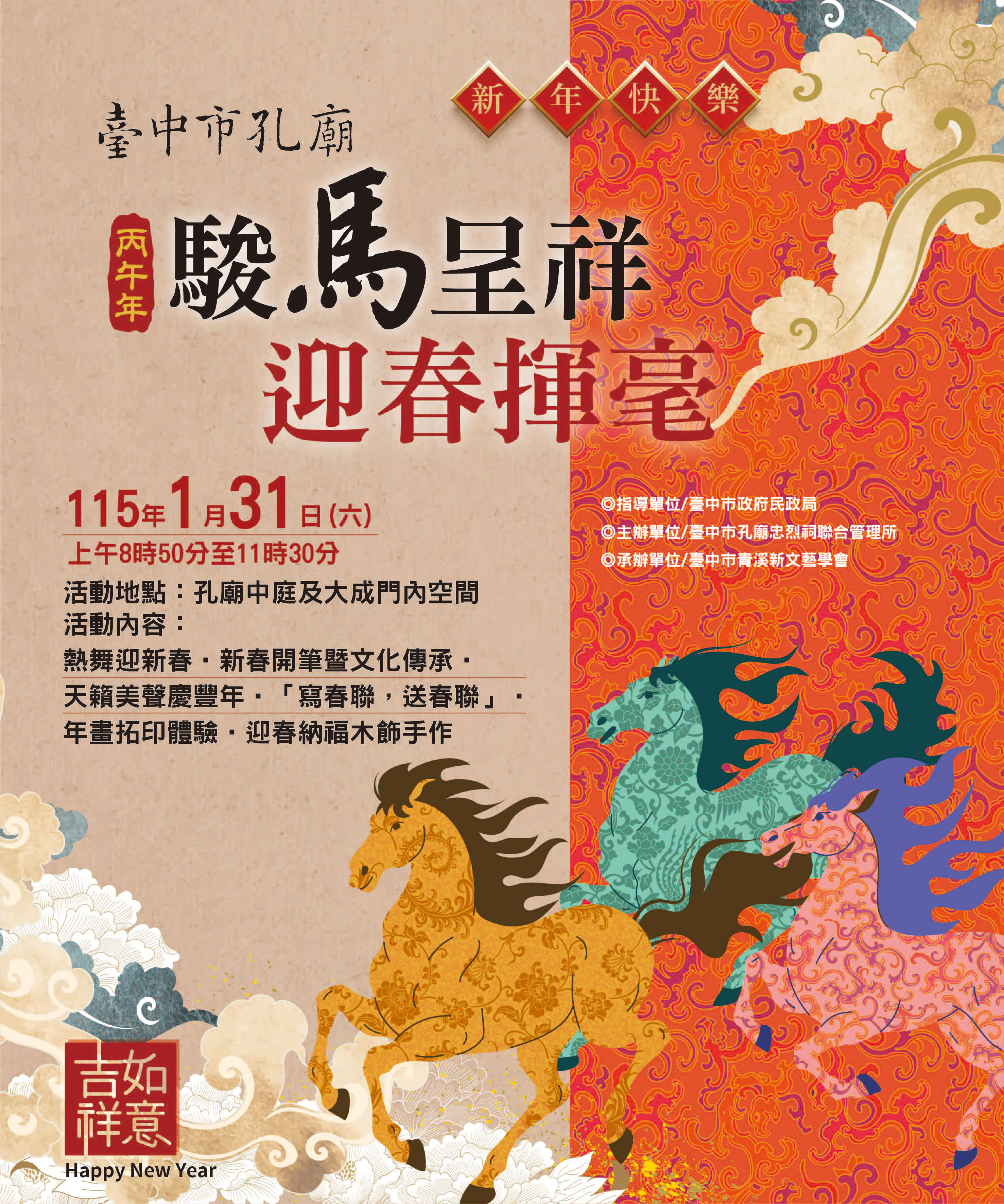轉知:臺中孔廟丙午年「駿馬呈祥,迎春揮毫」活動1/31登場