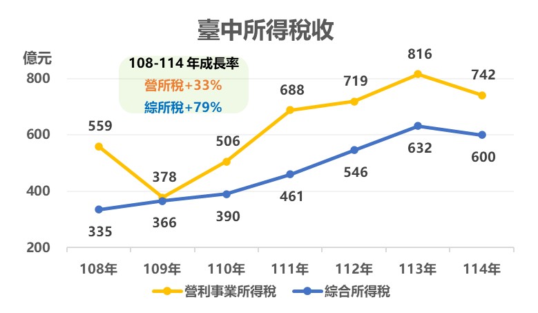 面對國際景氣波動與關稅不確定性挑戰,台中市政府經濟發展局表示,台中經濟仍展現高度韌性。根據財政部最新資料顯示,台中市綜合所得稅自108年335億元成長至114年600億元,增幅近80%;營利事業所得稅則由108年559億元成長至114年742億元,增幅約33%,兩項主要稅收成長率均居六都第3名,顯示市民所得與企業獲利基礎同步擴大、城市經濟底盤穩健。