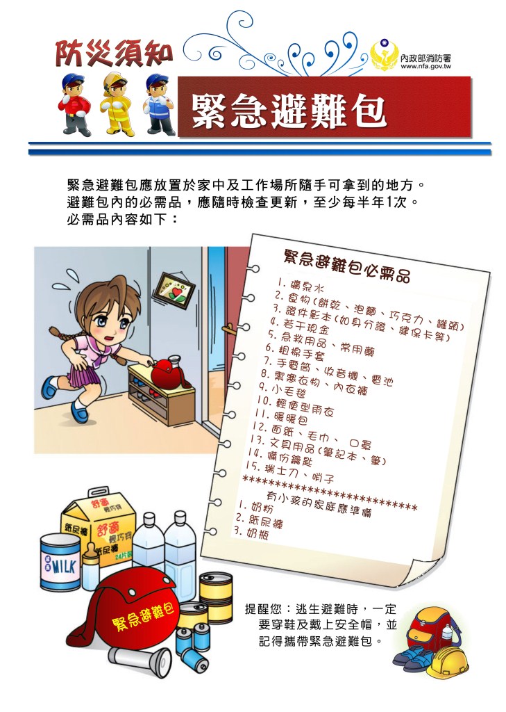 內政部消防署提供之緊急避難包防災須知宣導單張。