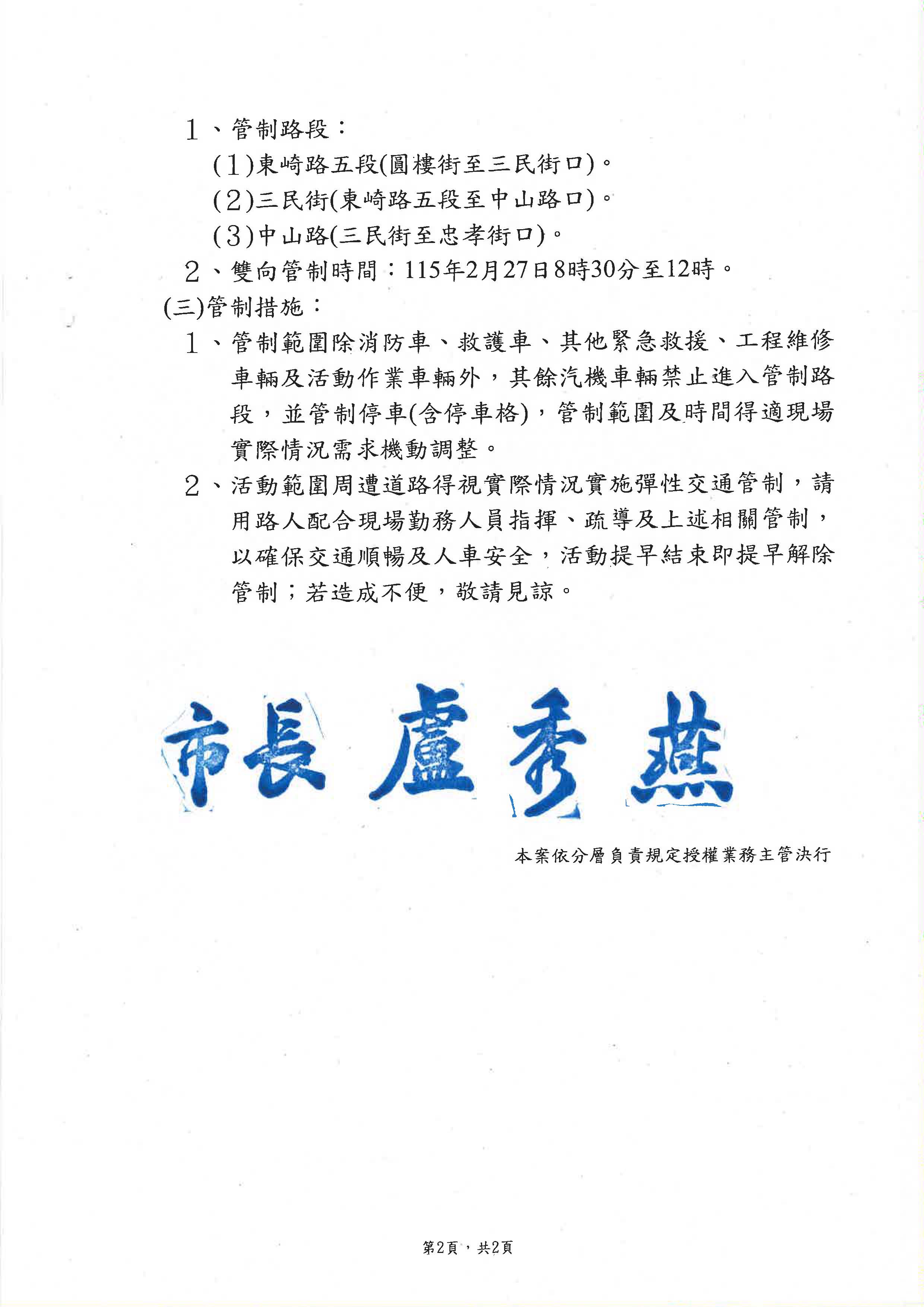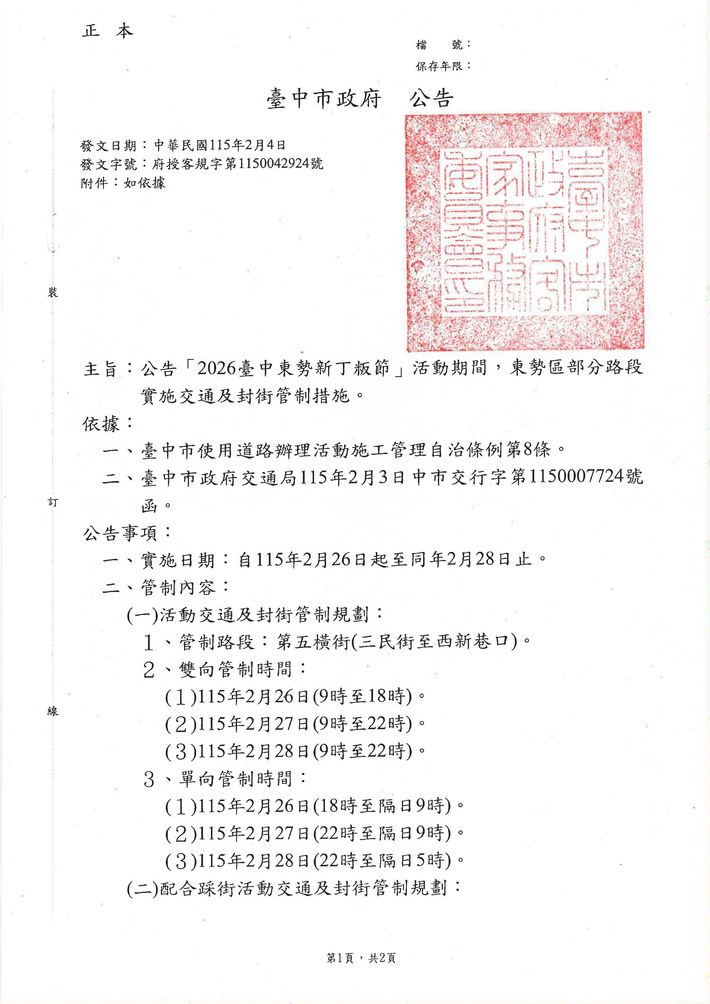 檢送「2026臺中東勢新丁粄節」活動期間實施交通管制公告1份,請參閱。