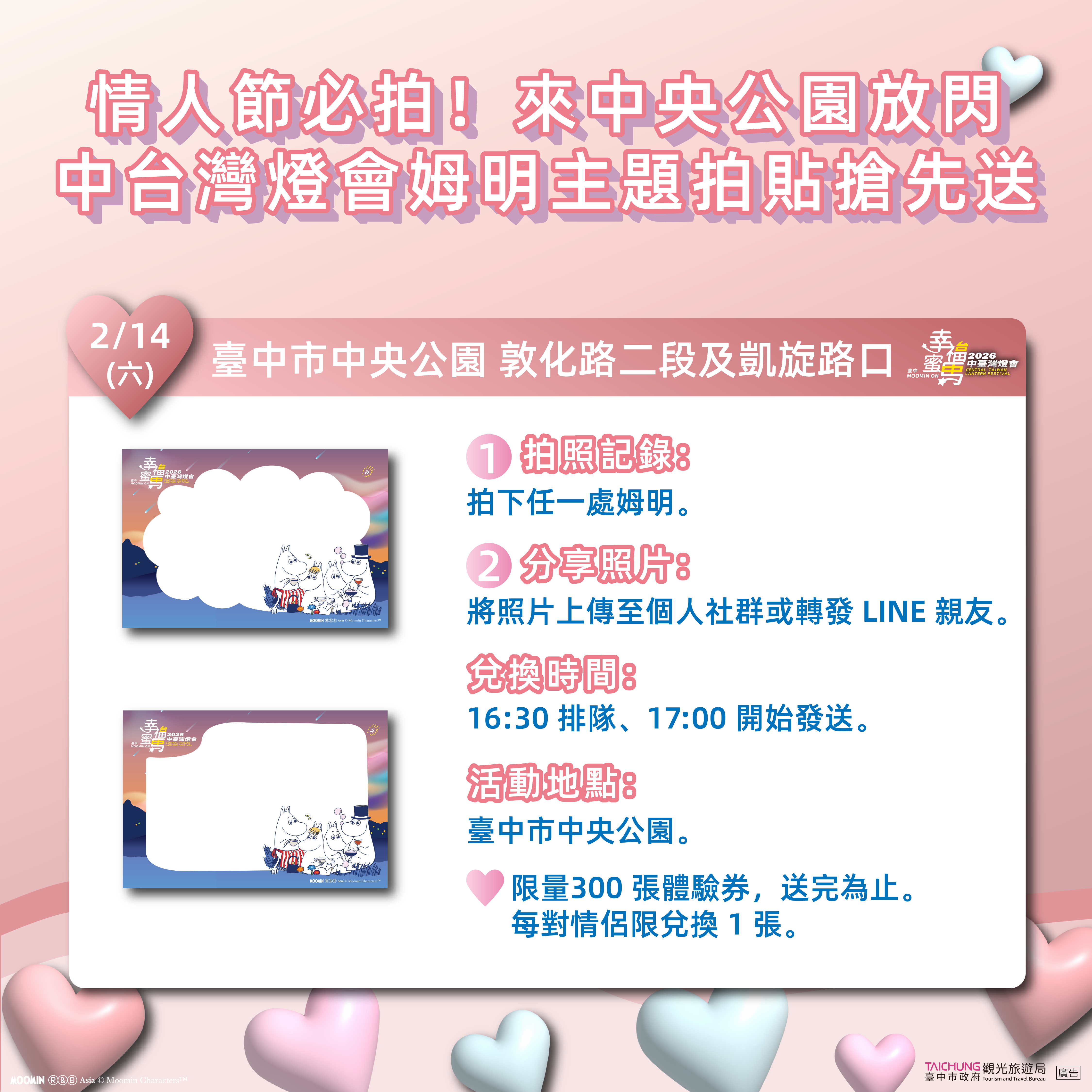 2月14日,就在春節連假第一天「拍姆明、送姆明」活動將於燈會主場地「中央公園」再送出1,000盞姆明小提燈(14時30分排隊、15時發送)與300份姆明拍貼體驗券(16時30分排隊、17:00發送),即日起只要拍下台中任一處的姆明,分享於自身社群(如FB、IG、Threads),或 LINE 轉傳給親朋好友,2月14日情人節當天來到「台中市中央公園」(敦化路二段及凱旋路口)即可兌換,一起沉浸在「幸福蜜馬 台中MOOMIN ON!」的浪漫氛圍!
