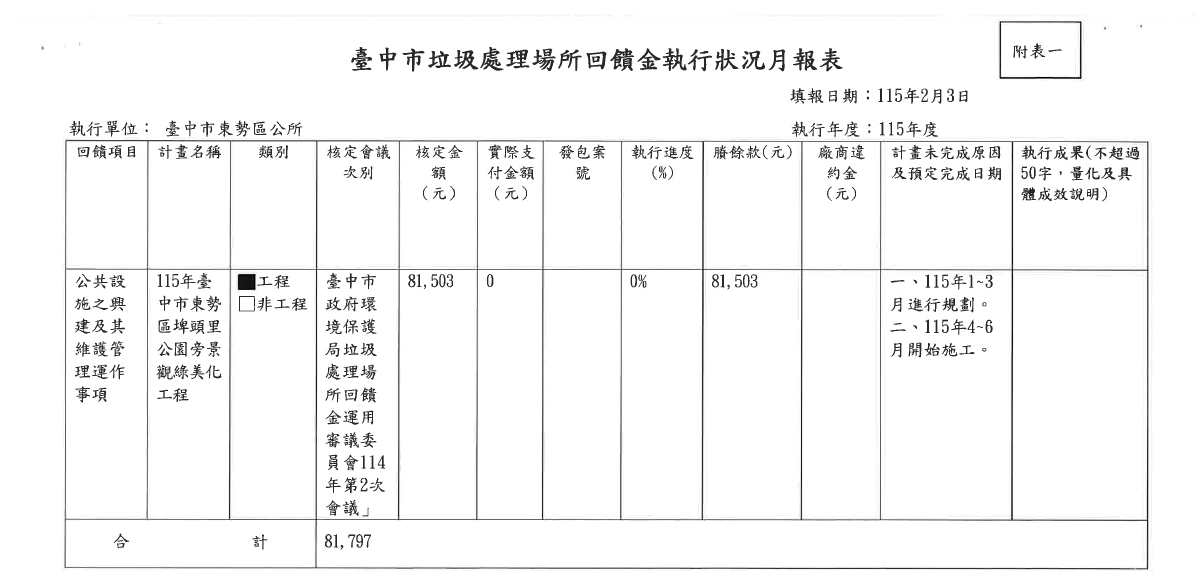 公告臺中市東勢區115年2月垃圾處理場所回饋金執行月報表