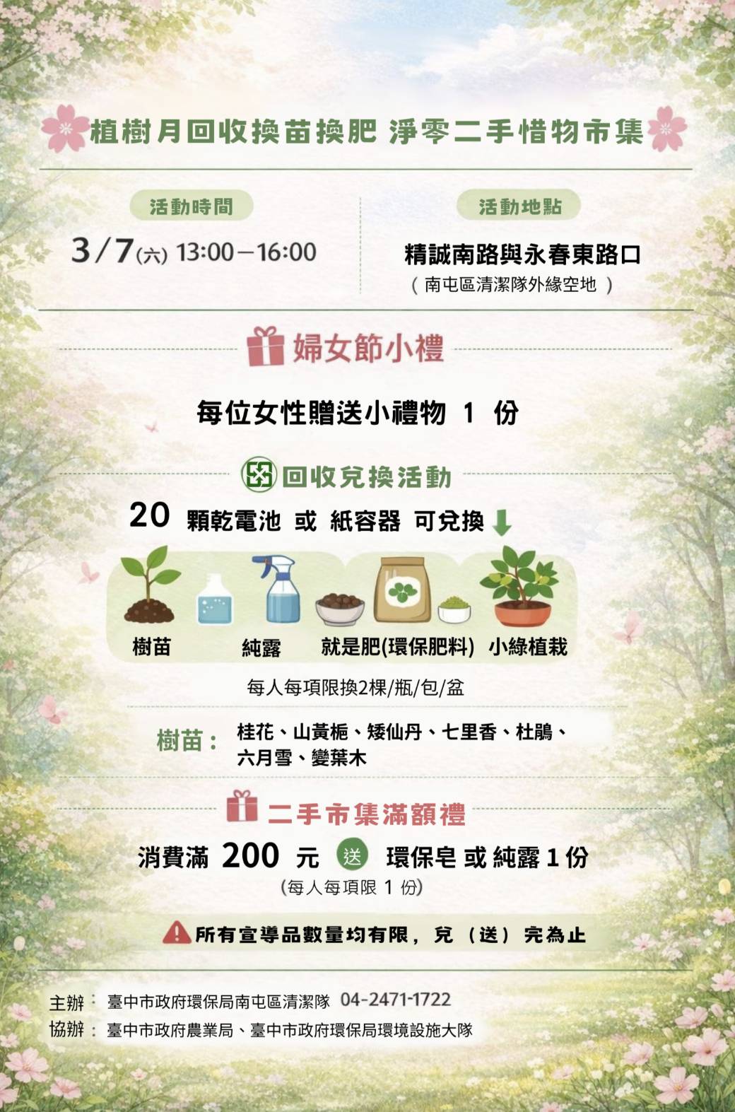 為響應植樹月並落實淨零綠生活理念,台中市政府環保局將於3月7日(星期六)13時至16時,在南屯區清潔隊外緣空地(精誠南路與永春東路口)舉辦「植樹月回收換苗換肥暨淨零二手惜物市集」活動,結合資源回收、植樹綠化及二手再利用行動,邀請市民一同減碳愛地球,為城市種下永續綠意。