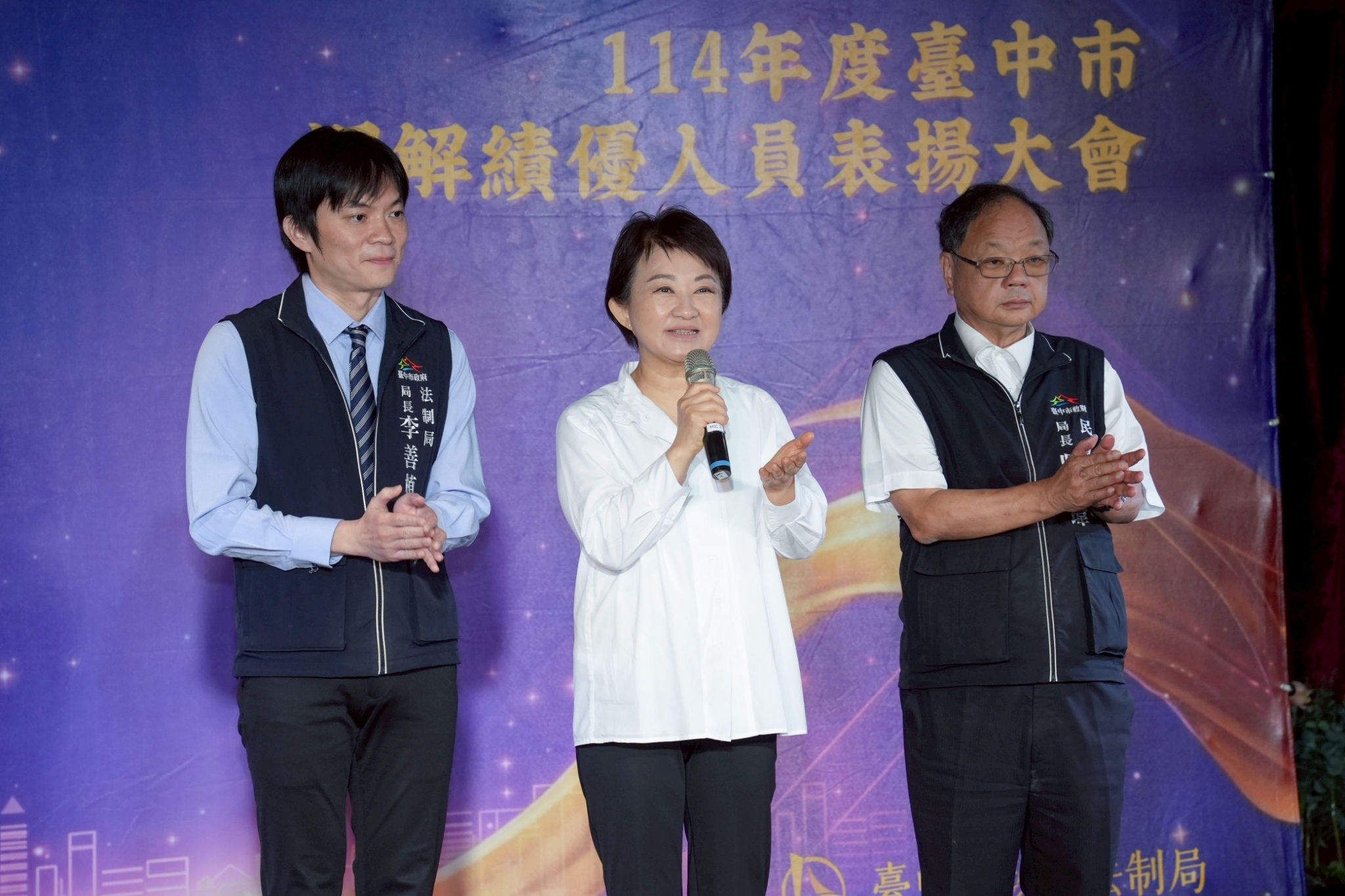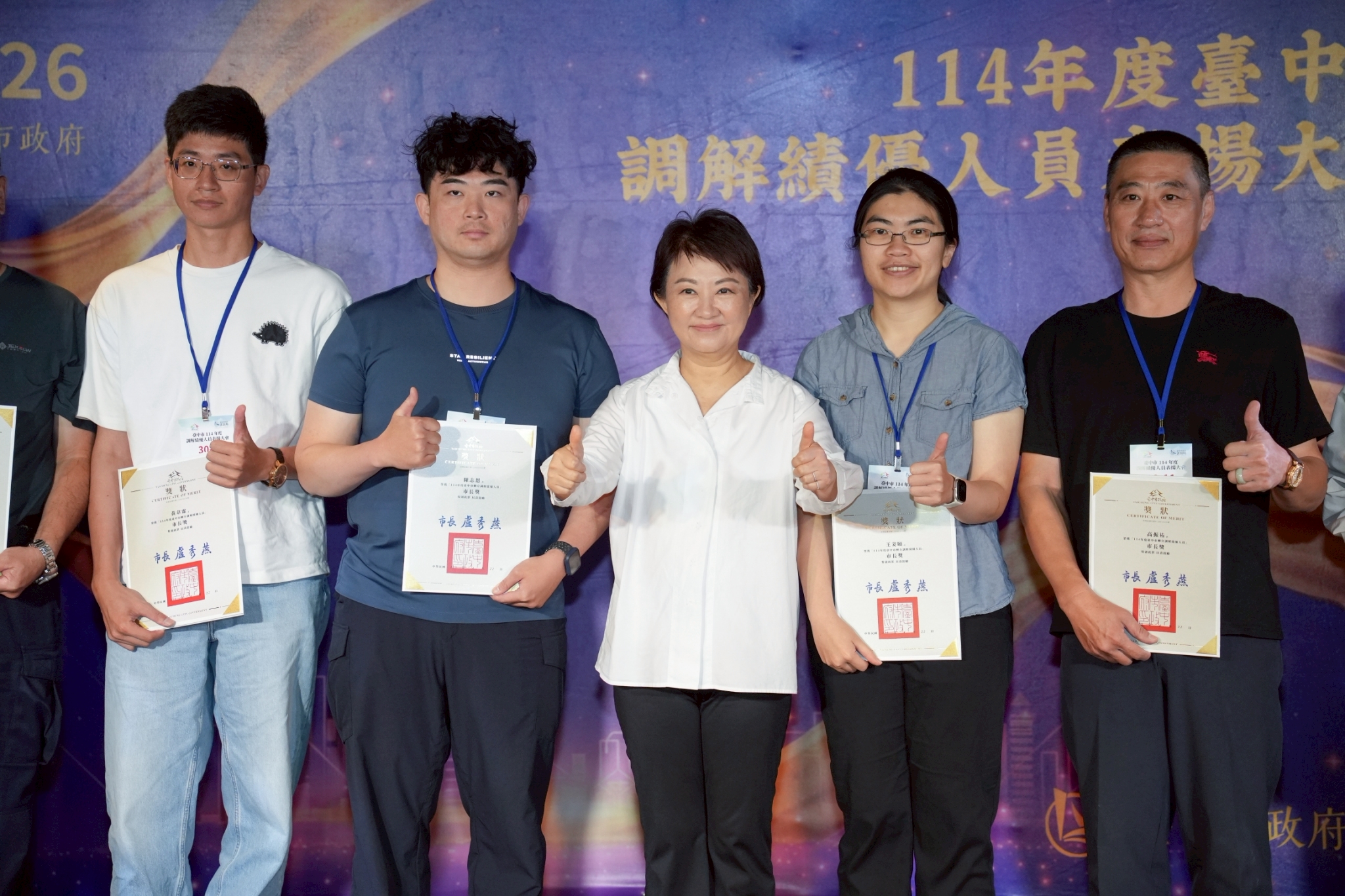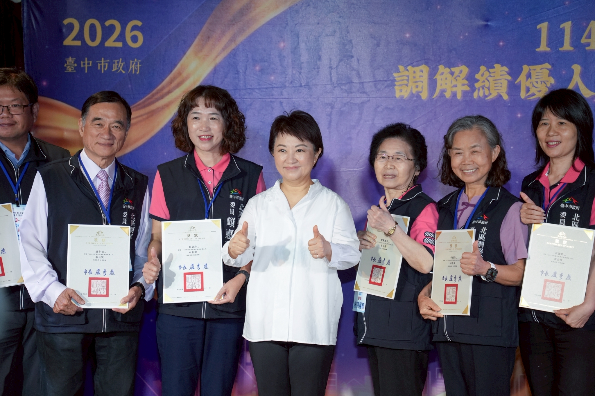 台中市政府於今(22)日在金典國際酒店舉辦「114年度調解績優人員表揚大會」,市長盧秀燕親自頒獎表揚調解績優有功人員,並代表台中市政府向全體調解人員協助排解民眾紛爭的貢獻表達感謝之意,正因地方團隊的長期耕耘及法制局積極推動,使台中市調解成立率自108年起至今皆高居全國第一。