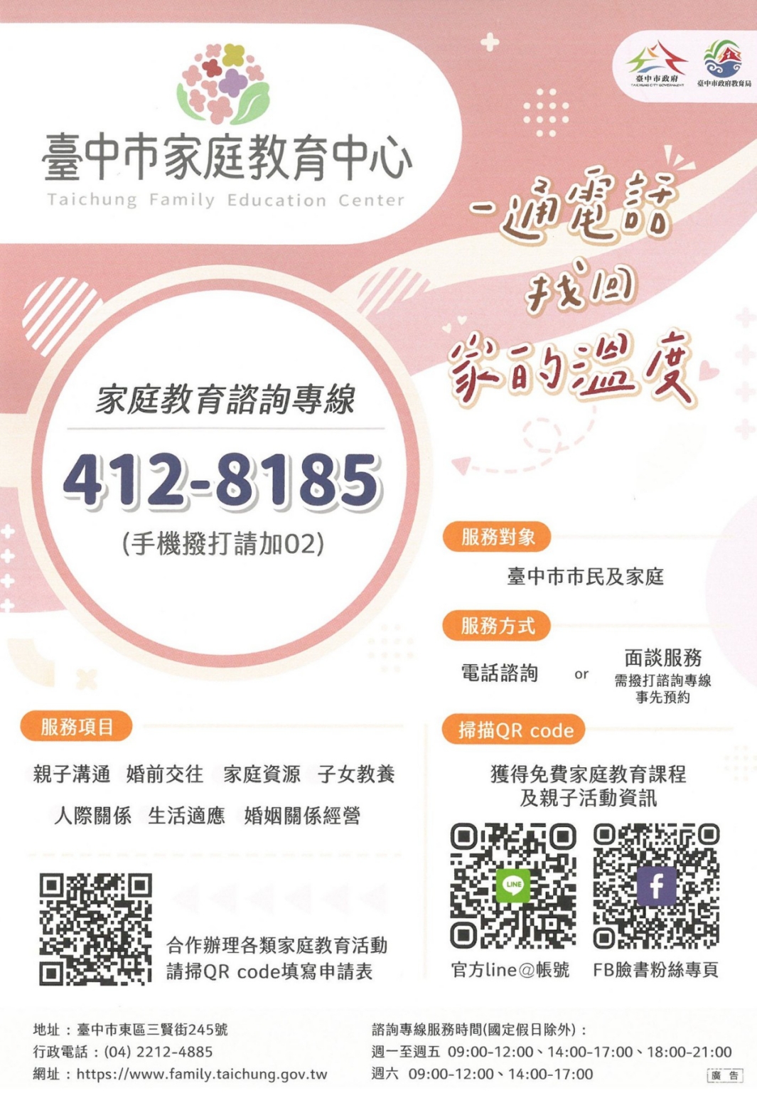 詳情請持續關注「台中市家庭教育中心」臉書粉絲專頁( https://share.google/OeCvnndUJtvnnAHFK )及LINE官方帳號( https://reurl.cc/3KGlOX ),掌握最新相關資訊。(4/23*10)*教育局