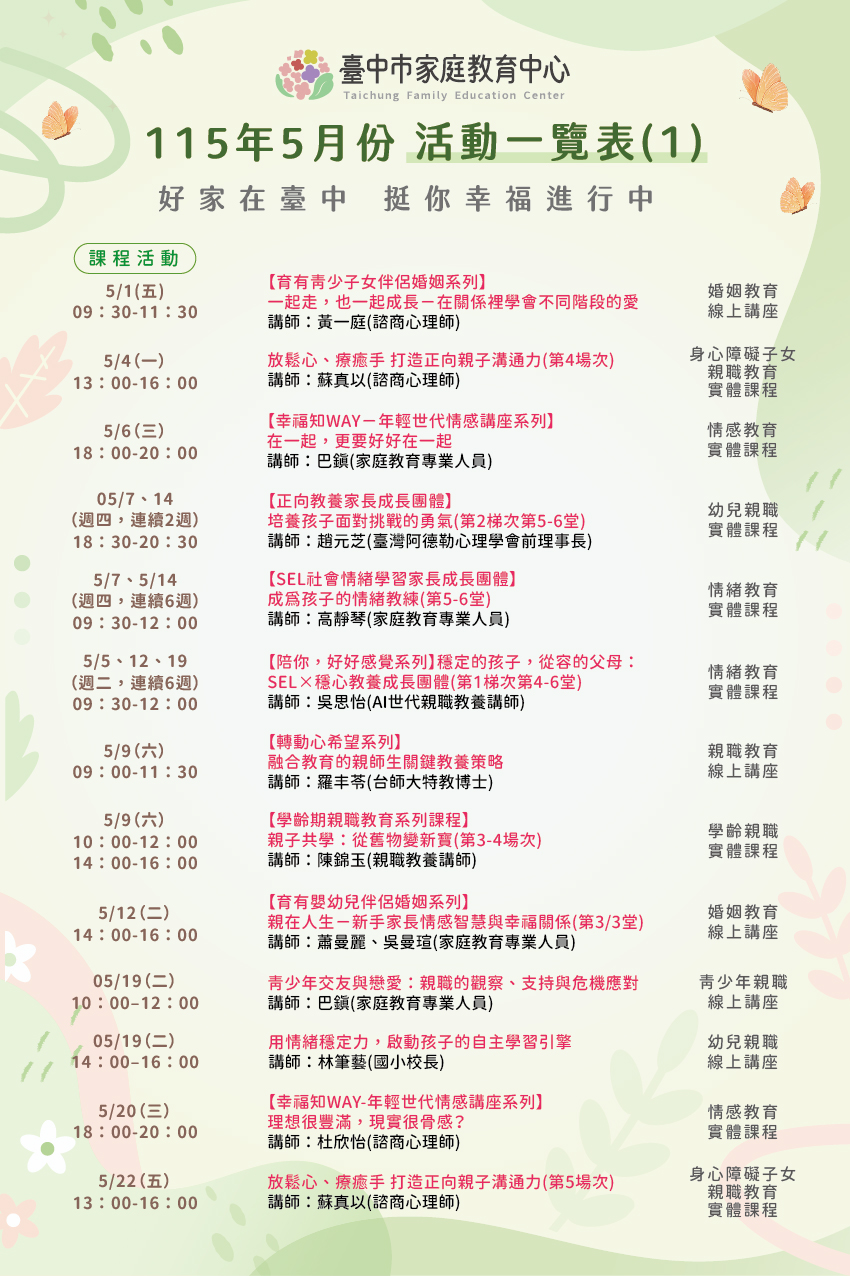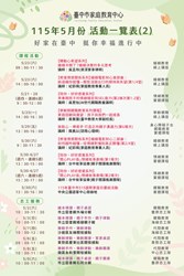臺中市家庭教育中心【115年5月份活動一覽表】🍀五月溫馨上架🍀